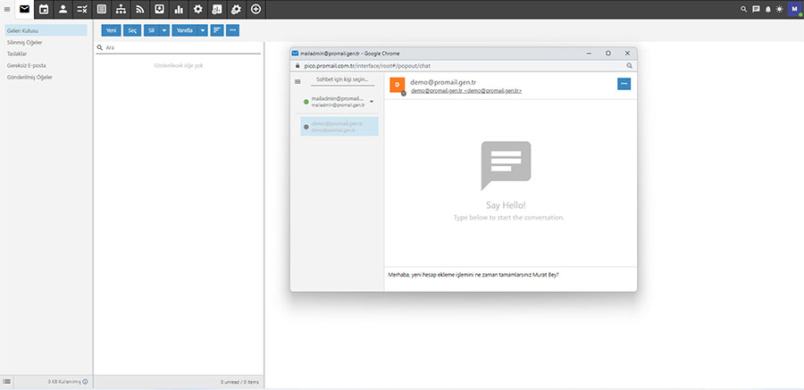 Günümüzde birçok firma tarafından sunulan anlık mesajlaşma uygulamaları bulunuyor. Ancak bu uygulamalar çoğu zaman dikkat dağıtıcı ve güvenlik risklerine sahip olabilmektedir. Kurumsal e-posta hizmetinde bulunan ekip içi mesajlaşma uygulaması ile ekip üyelerinizin dikkatinin dağılmasına ve güvenlik riski ile karşı karşıya kalmasına engel olarak şirket içi yazışmaları verimli bir şekilde yapmalarına imkan tanıyabilirsiniz.